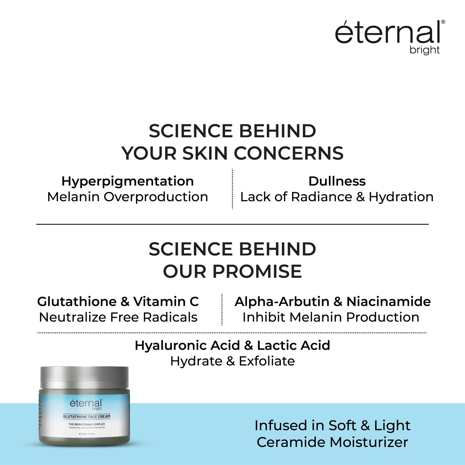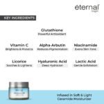 eternal bright Glutathione Face Cream the brightening complex a skincare solution designed to enhance your natural radiance. This cream enhances the brightness of the skin with a mix of active ingredients, such as Glutathione, Alpha-Arbutin, Niacinamide, Licorice extract, Vitamin C, and Ceramide. This mild fragrance cream caters to those seeking a gentle yet effective approach to skin brightening and hydration.BENEFITS OF GLUTATHIONE FACE CREAM: