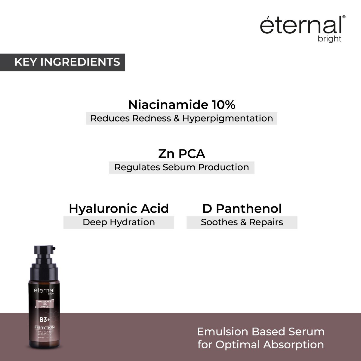 Why Choose Eternal Bright Niacinamide Serum? Enlarged pores, oily skin, pigmentation, and dullness can make skin appear uneven. Eternal Bright Niacinamide Serum is specifically designed with 10% Niacinamide combined with Zinc PCA to regulate oil, tighten pores, and brighten skin. This scientifically balanced formula addresses multiple concerns in one bottle, making it ideal for all skin types, including acne-prone skin.INGREDIENTS: