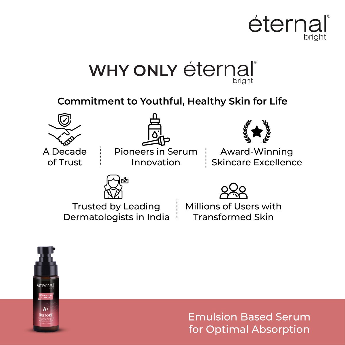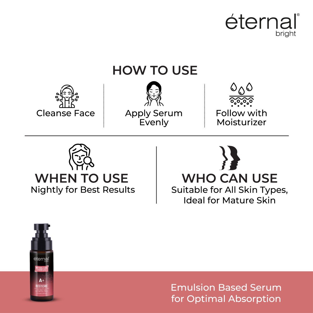 1. Ensure that your face is thoroughly cleansed and dried before applying the serum. 2. Apply a small amount of the serum to a discreet area of your skin and wait for 24 hours to check for any adverse reactions. 3. Take a pea-sized amount of the eternal bright Retinol Serum onto your fingertips. 4. Gently massage the serum onto your face using circular motions. Focus on areas of concern, such as wrinkles, fine lines, or uneven skin tone. 5. Allow the serum to fully absorb into your skin before applying any additional skincare products.DERMATOLOGIST NO. 1 CHOICE